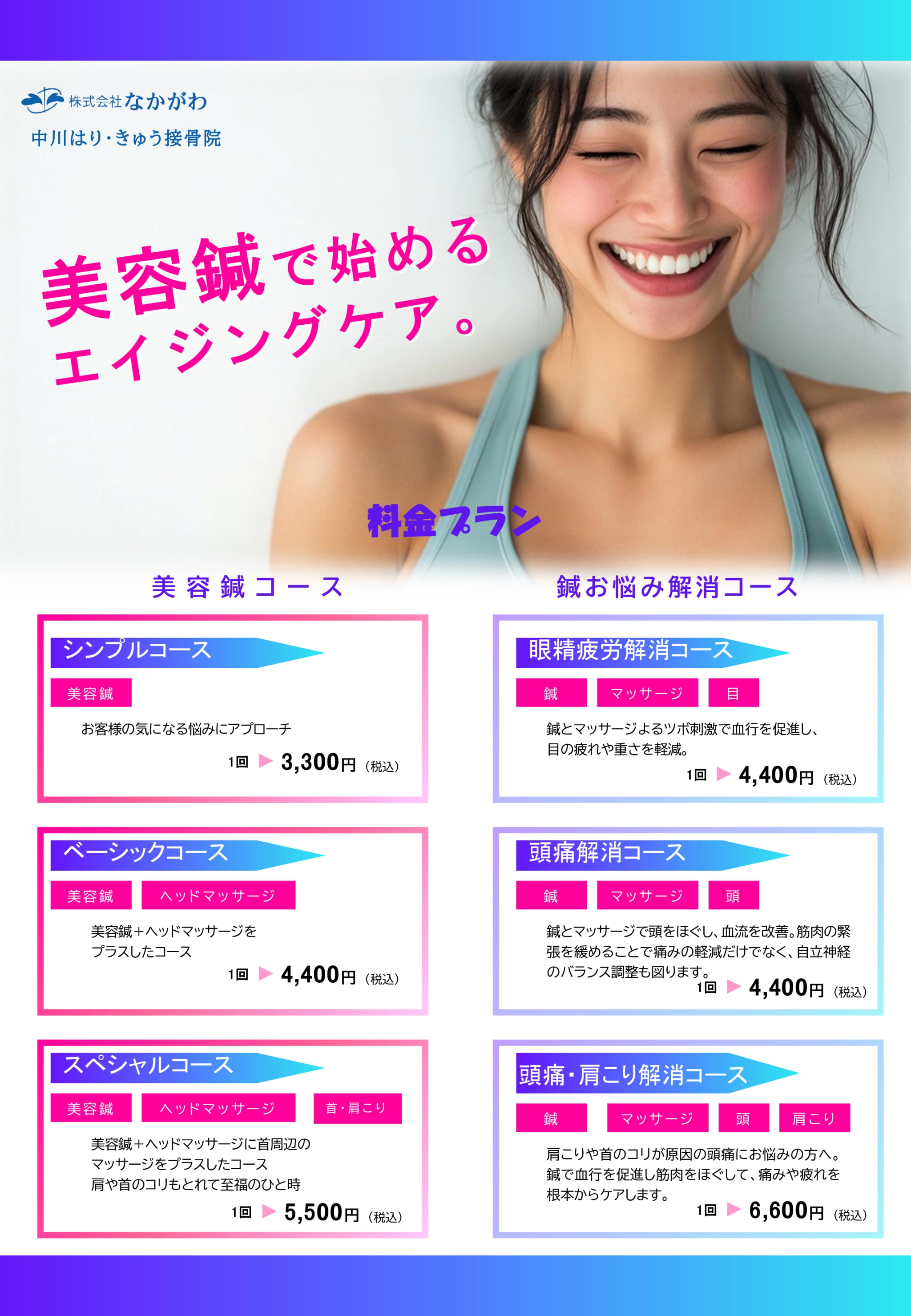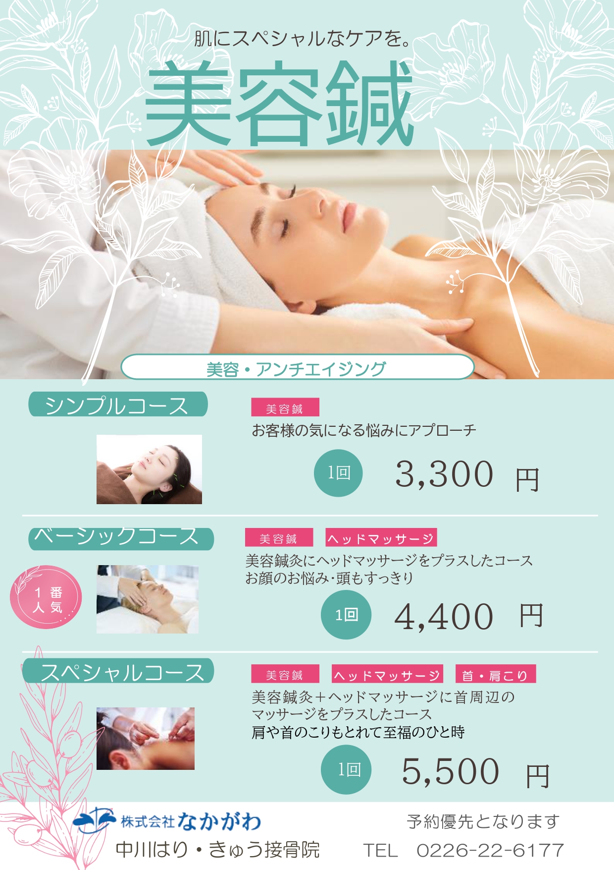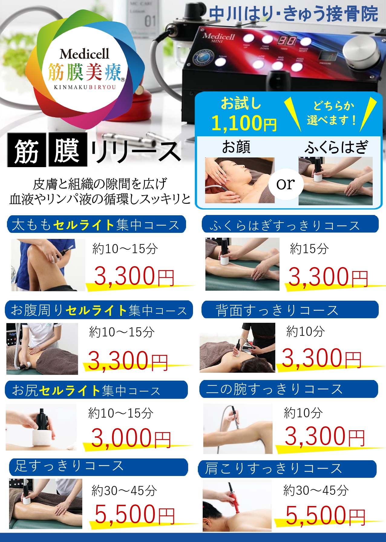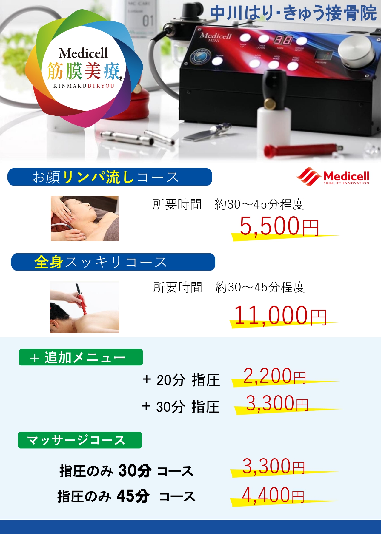 中川はり・きゅう接骨院では、美容鍼灸(お顔のみ)・筋膜美療(リラクゼーション)を行っております。